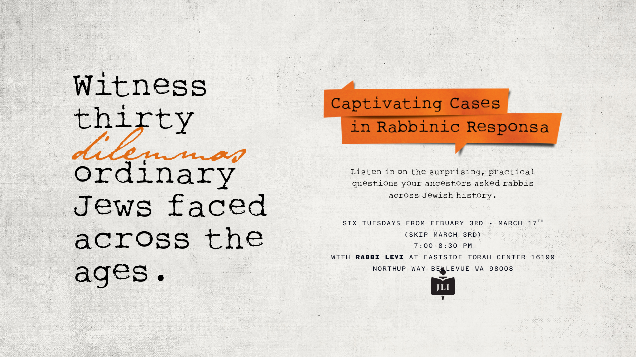 7:00-8:30 pm at Eastside Torah Center 16199 Northup Way Bellevue WA 98008